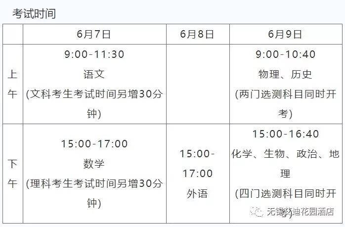 江苏省普通高考模式为“3+学业水平测试+综合素质评价”。“3”指统考科目:统考科目为语文、数学、外语;学业水平测试科目:政治、历史、地理、物理、化学、生物、技术;综合素质评价:道德品质、公民素养、交流与合作、学习能力、运动与健康、审美与表现。今年考试时间具体为: